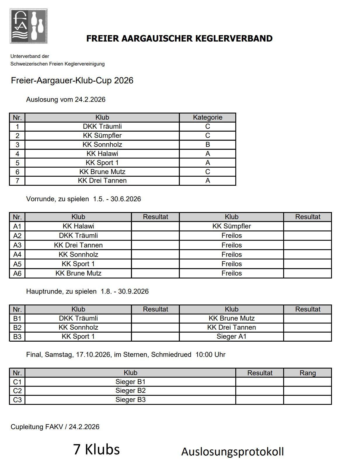 Es haben sich dieses Jahr folgende 7 Klubs für den FAKV Klub-Cup angemeldet