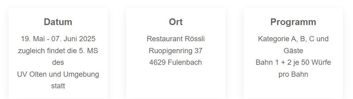 Der Unterverband Olten und Umgebung heisst alle Keglerinnen und Kegler zum 68. Unterverbands-Mannschaftswettkampf 2025 im Restaurant Rössli in Fulenbach herzlich willkommen.